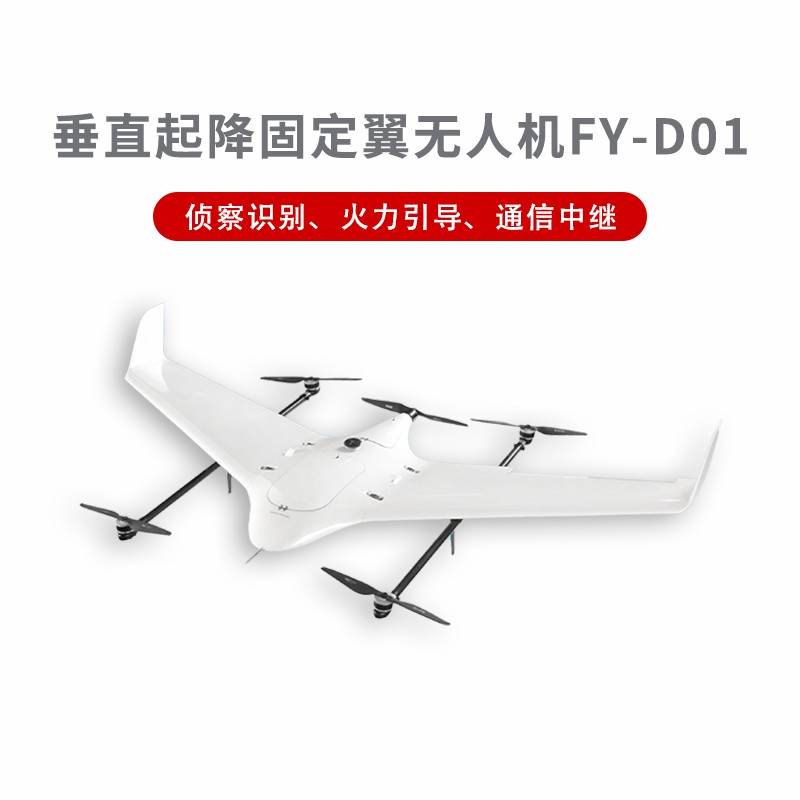 垂直起降固定翼无人机FY-D01型,兼具旋翼与固定翼优势,其结构紧凑,便于运输,抗风能力与防护性能好,适应复杂环境。续航持久,巡航稳定,载重2.5kg,可满足日常执行任务需求。